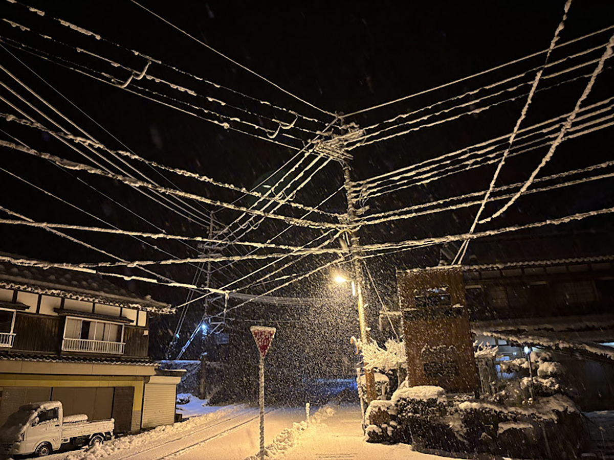 宿の前の湖はこんな感じで、湖面は雪で覆われ、夜になると空にクモの巣を張ったように電線に雪が降る積もる。