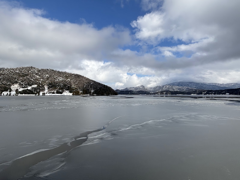 前日からの積雪で、湖面に雪が積もっているのか、凍ってるのか、とにかく珍しい光景。その湖面を割って進む「湖面結氷クルーズ」です。