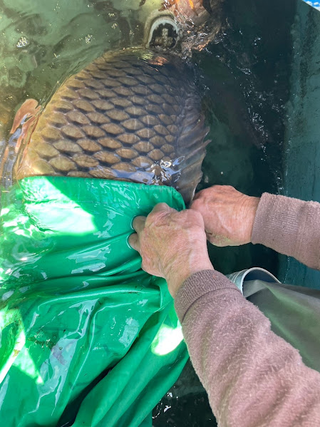 前日に『刺し網漁』の網を湖底に仕掛け、翌朝回収に行くのですが……「おえ!みんな、見てくれこれを!!」と父が漁から帰って来ました。漁に出かけていた船を見に行くと、化け物のようなコイが!重量はなんと24キロ!!