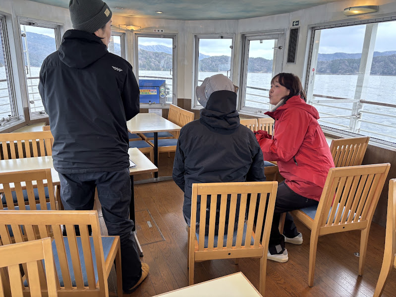 2日目の観光船レイククルーズでの現場研修会では、湖をどのように巡り、その時々にどのようなガイダンスを繰り広げるのかを検討・確認することができました。