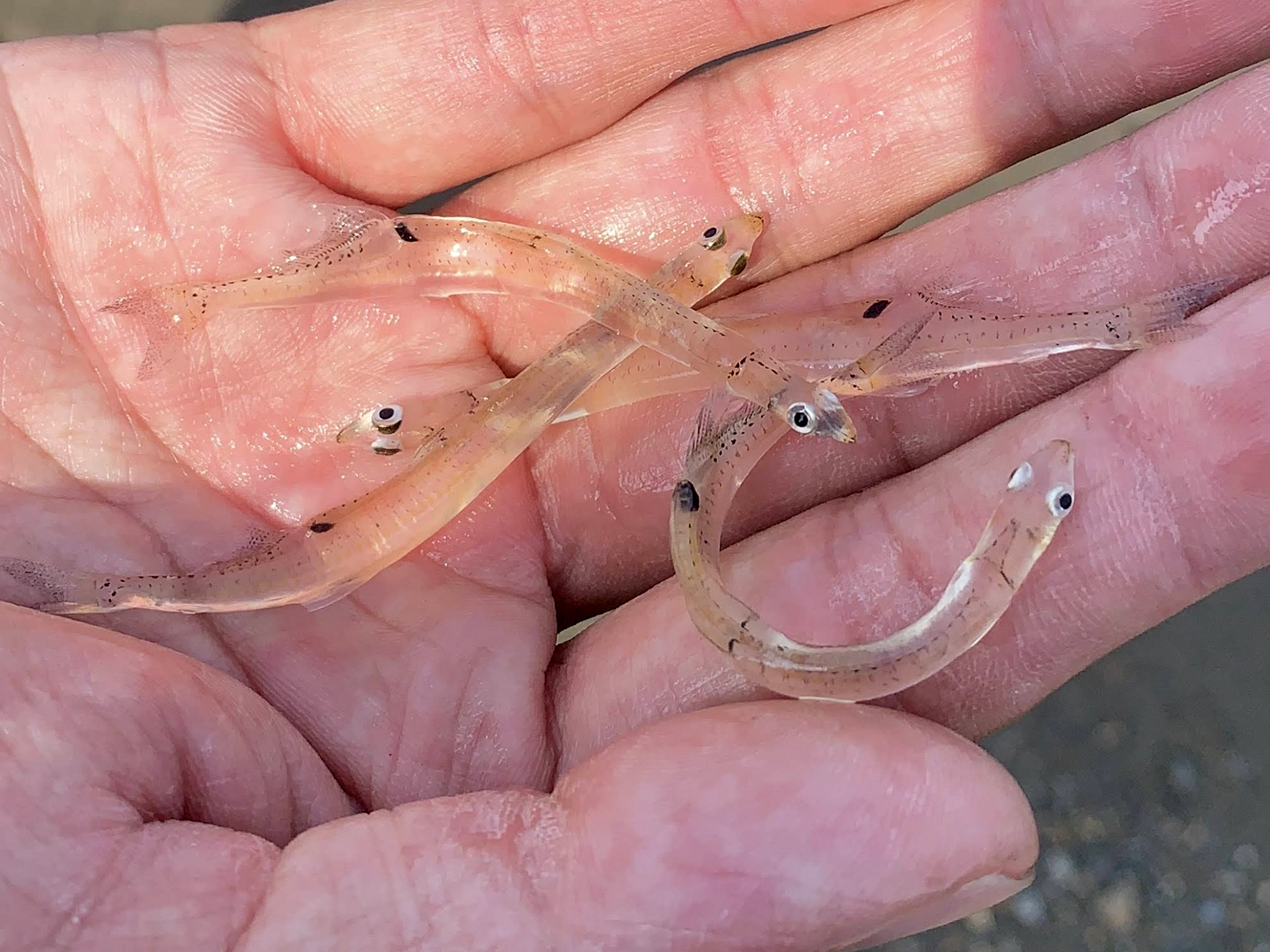 風の吹く方向によってどこの岸に寄るかが変わるシラウオ。岸沿いに寄ったところを、大きな網でひとすくい!本当に透明なシラウオが捕れるのです。