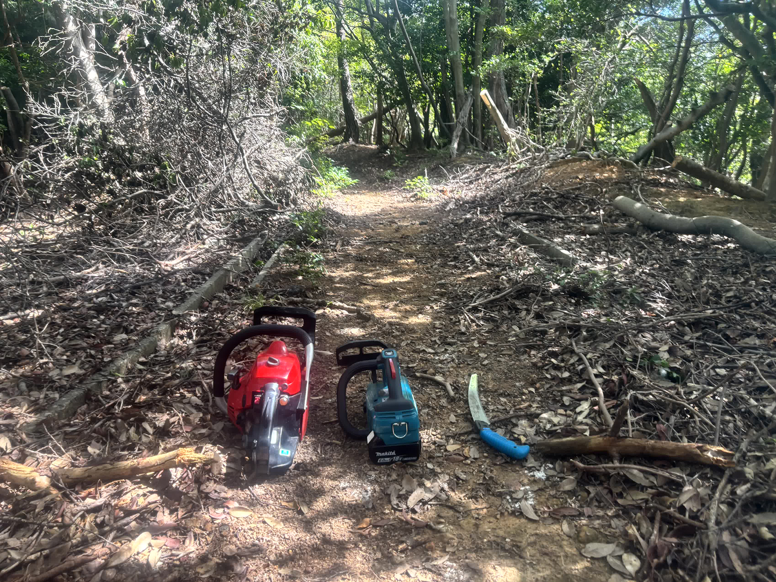 時間を見つけては、腰に「鈴×2個」「スズメバチジェット(殺虫剤)」「熊退治スプレー」「ノコギリ」「飲み物」をぶら下げて、トレイルコースの整備に取り組んでいます。