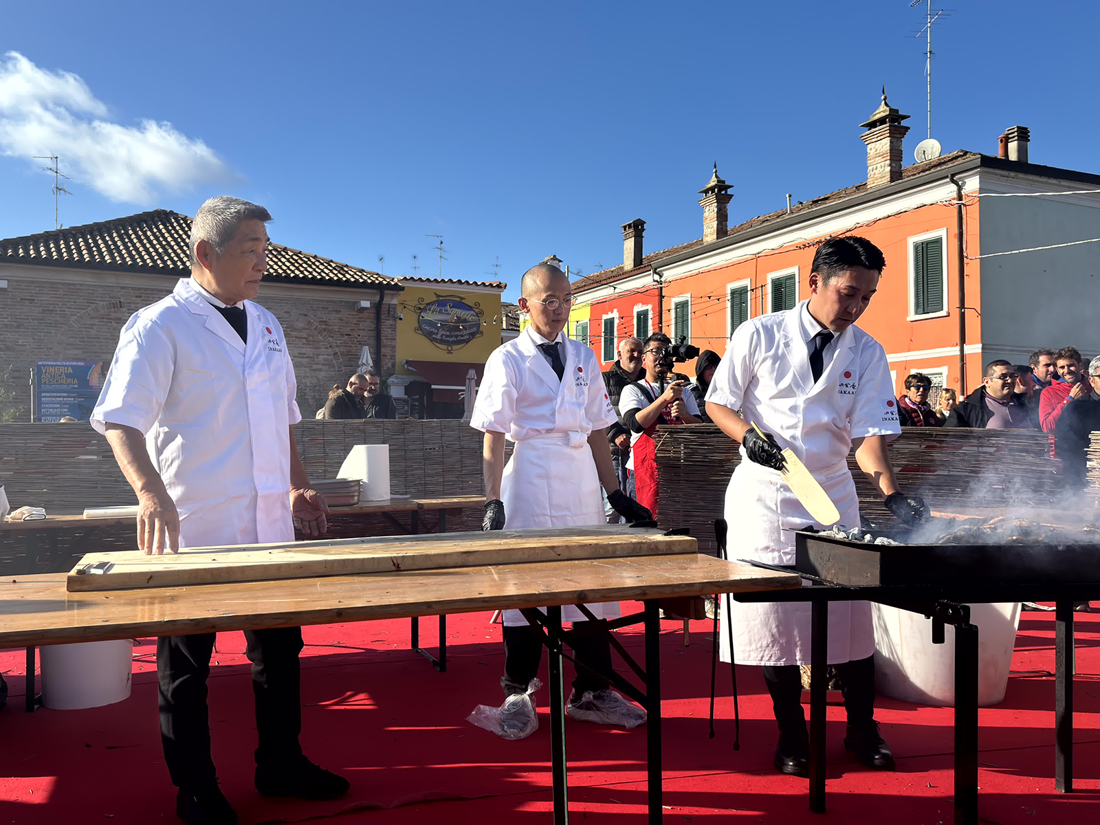 基本的にうなぎ自体が大きくてビックリしました。三方五湖では最大でも1キロ程なのですが、コマッキオでは1キロは普通。大きいものだと3キロのうなぎもいるようです。もう、うなぎとは思えない様相をしています。 そんなうなぎを捌くのですから大変です。「捌き方」にも、背開き・腹開き、縦まな板・横まな板の違いはありましたが、どちらもきれいに捌かれていて見事でした。一番の違いを感じたのが「焼き方」です。田舎庵さんが1匹に対し10本ほどの串を打つのに対し、コマッキオの焼き方は、焼き網の上で焼くのみ。この「串を打つ」ということに、現地の方々は珍しさを感じているようでした。